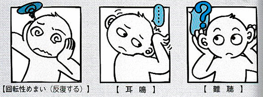1)回転性めまい 自分もしくは周囲がグルグルと回る激しい 回転性のめまいで、吐き気や嘔吐を伴う事もあり、めまい 発作は30分から数時間続き、間隔も頻度も一定しない。 2)耳鳴り、難聴 初期にはめまい発作や発作前に耳が詰まっ た閉塞感や圧迫感を感じる事があるが、めまいを繰り返して いるうちに耳鳴りや難聴を伴う様になる。難聴ははじめ低い 音から聞き取り難くなる事が多く、発作を繰り返しているう ちに、中音域から高音域も聞き取り難くなる。 2)自律神経症状 吐き気、冷や汗、動悸、悪心嘔吐などの 自律神経症状を伴う事が多い