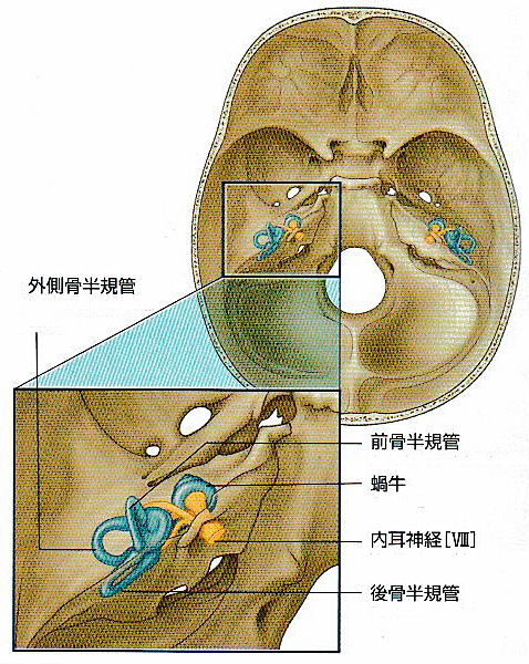②前庭器官:平衡情報を感受し、前庭神経によって脳幹の前庭神経核 に伝える器官で次の二つのきかんを持つ。 1.前庭(球形嚢と卵形嚢からなる)~重力と直線加速度を感受する 2.半器官(前半・後半・外側半器官)~回転加速度を感受する