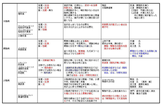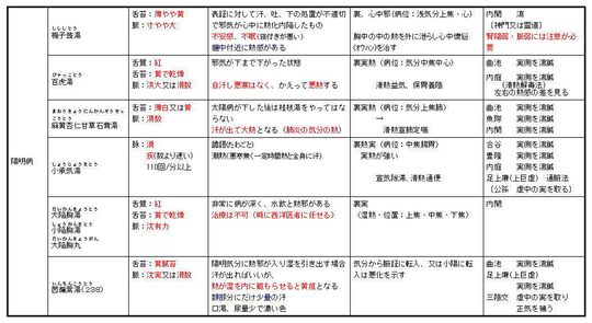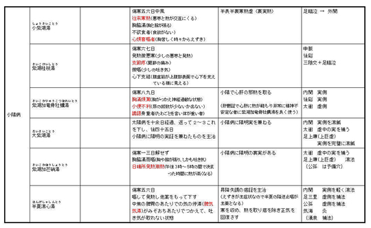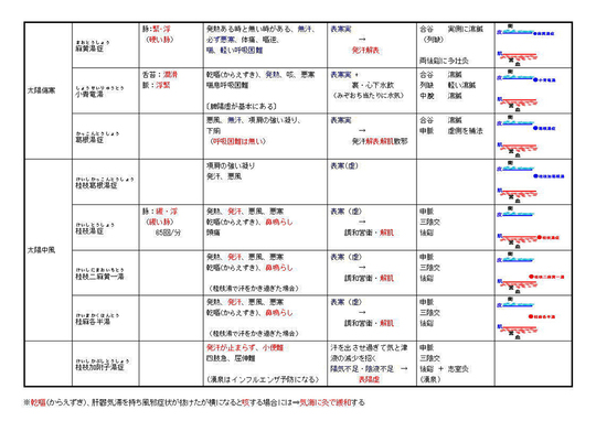 寒い時期に起こる傷寒病・中風系のものを通常のインフルエンザに相当し下記の一覧表を参考とする。