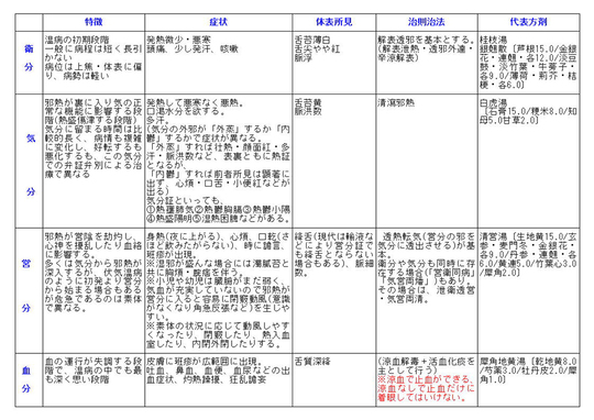 上記の傷寒表および衛気営血表は、株式会社たにぐち書店「鍼灸医学に於ける実践から理論へパート4及び、株式会社緑書房「東洋医学鍼灸ジャーナルvol09:瘟疫病について(北辰会代表 藤本蓮風)」を参考にしております